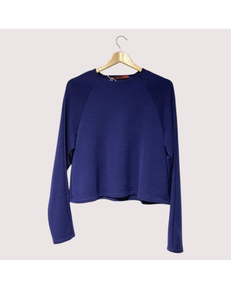 Maglia donna corta in lana girocollo, realizzata in Italia dal laboratorio sartoriale Lavgon. Made in Italy. Taglio asimmetrico. Composizione: 100% lana fine. Taglia S 38-42 M 44-46 L 48-50.