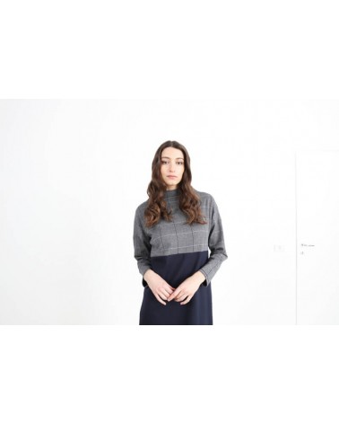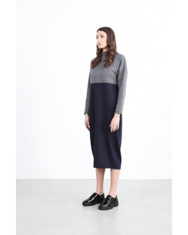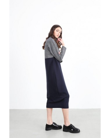 Un vestito che ti conquisterà. Realizzato in sartoria con doppio tessuto. Il tinta unita blu notte è unito al pied de poule per la parte superiore. Capo sartoriale. Composizione: Tinta unita: 65% viscosa 30% lana 5% elastane. Pied de poule: 100% cotone.