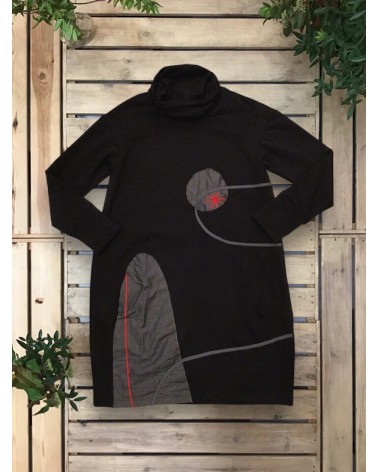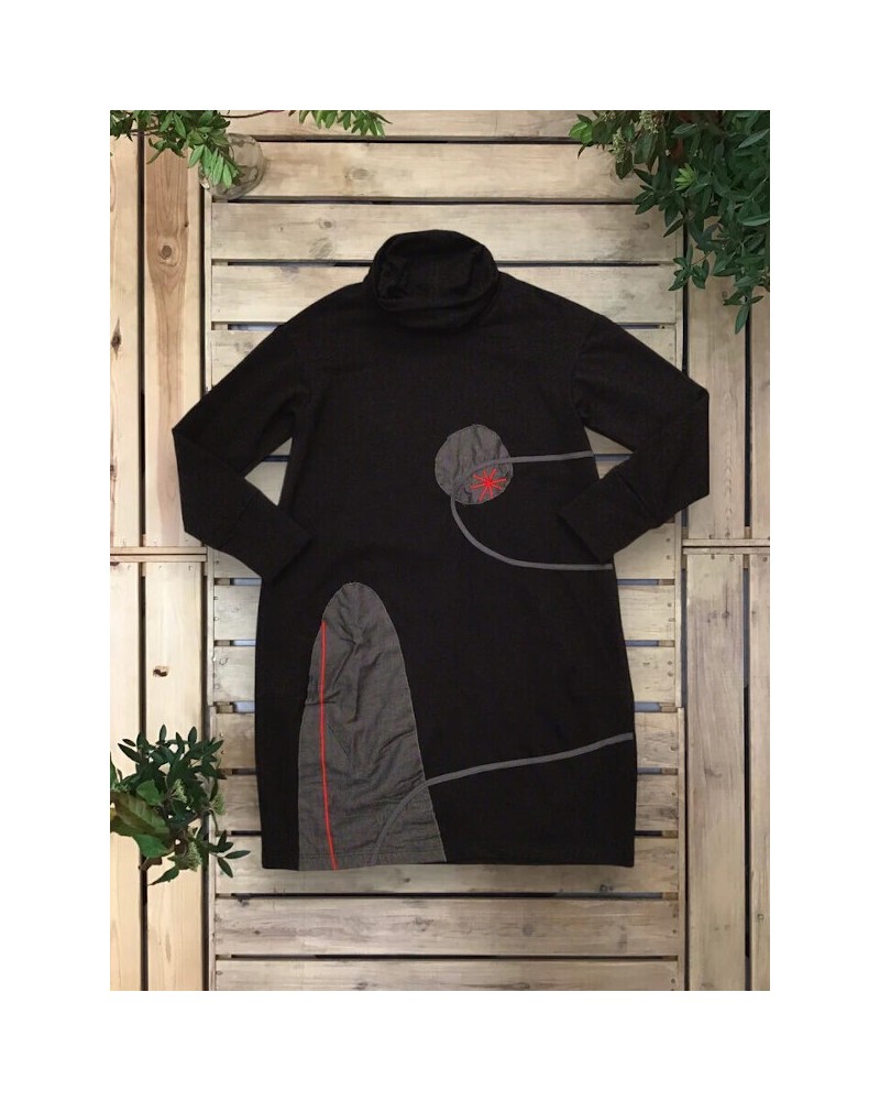 Vestito nero a ovetto collo alto con applicazioni Articolo di sartoria.