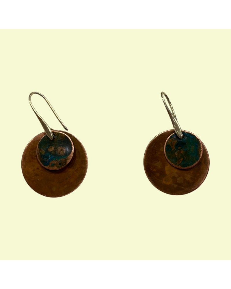 Orecchini artigianali in metallo ossidato con doppio elemento circolare.