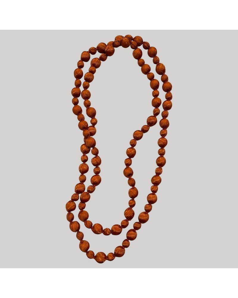 Collana pregiata in seta con sfere di legno, realizzata a mano con telai artigianali in legno.