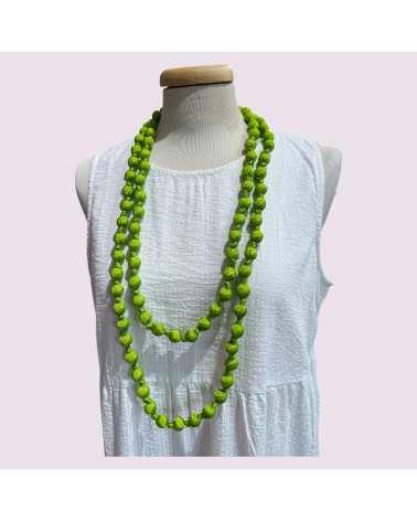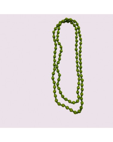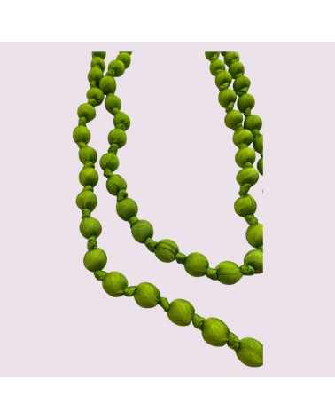 Collana verde lunga in seta e perle di legno leggere tinture ecologiche azo-free.