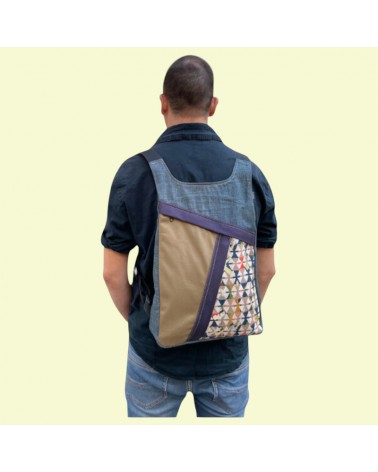 Zaino in cotone con tessuto fantasia. Due tasche frontali e due nel retro. Cm 40 x 27 x 8. Realizzato in Spagna. Prodotto artigianale