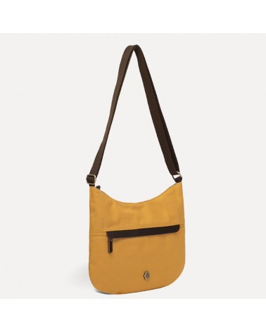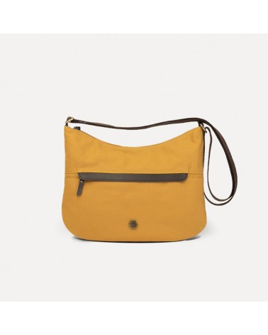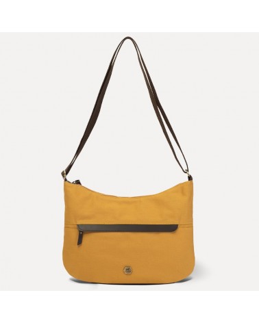 Borsa in tessuto giallo ocra con tracolla regolabile ed inserti in pelle.