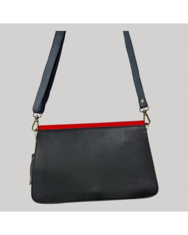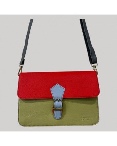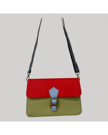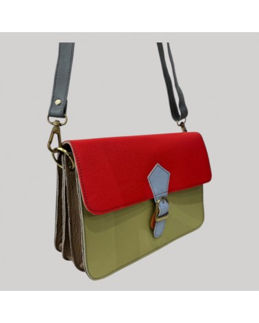 Borsa rettangolare in pelle riciclata rossa e verde con tracolla.