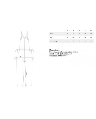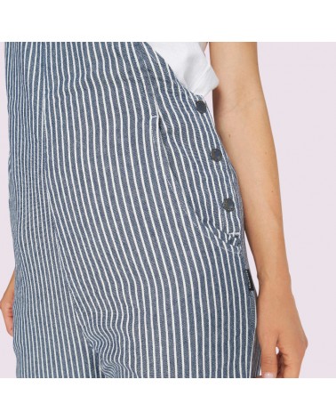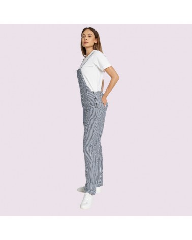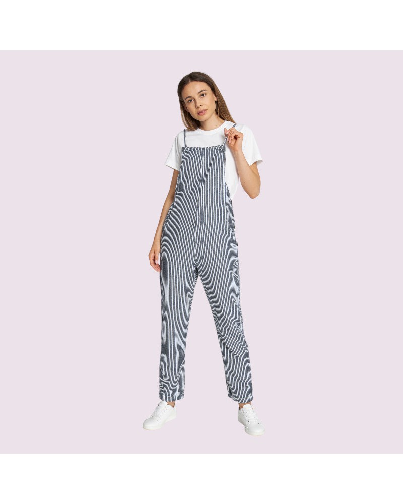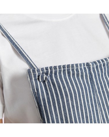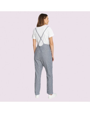 Tuta ampia stile grembiule con spalline incrociate sul retro. Due tasche posteriori a filetto e due tasche laterali. Realizzato in cotone biologico.