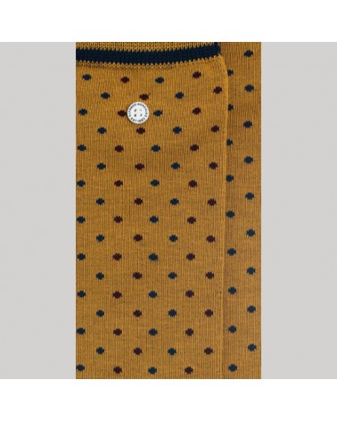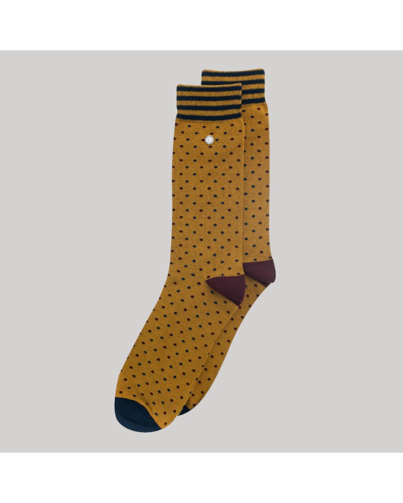 Queste calze sono realizzate in cotone pettinato di alta qualità e con una costruzione a 168 aghi che lo rendono un calzino molto comodo e resistente. I nostri calzini sono fatti per durare e la linea giallo ocra puntinata non fa eccezione.