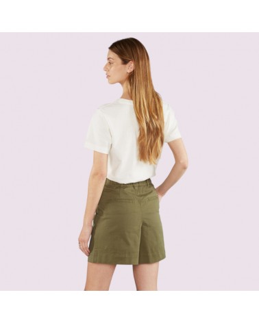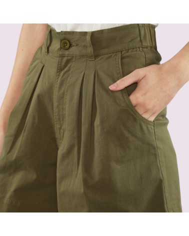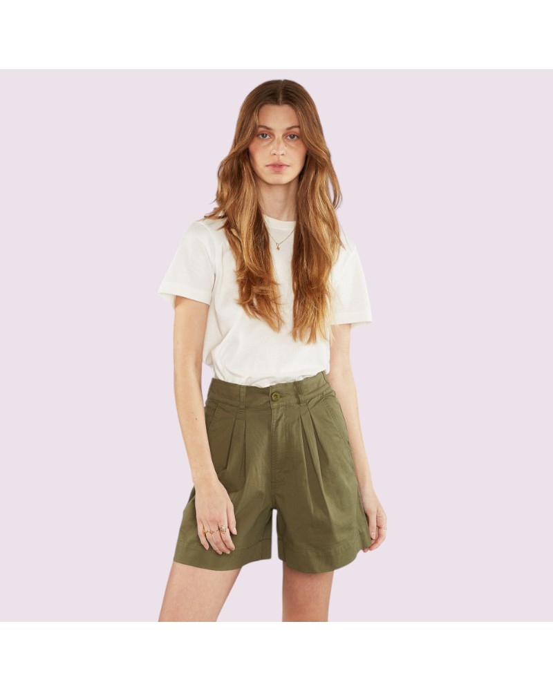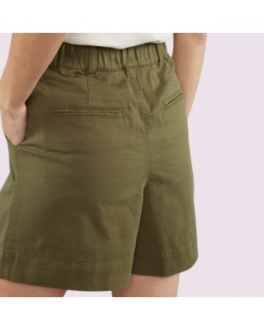 Pantaloncini da donna preppy a vita alta con tasche e pieghe sul davanti. Tasche a filetto sul retro. Elastico in vita sul retro con passanti per cintura per una bella forma in vita.