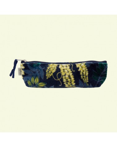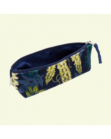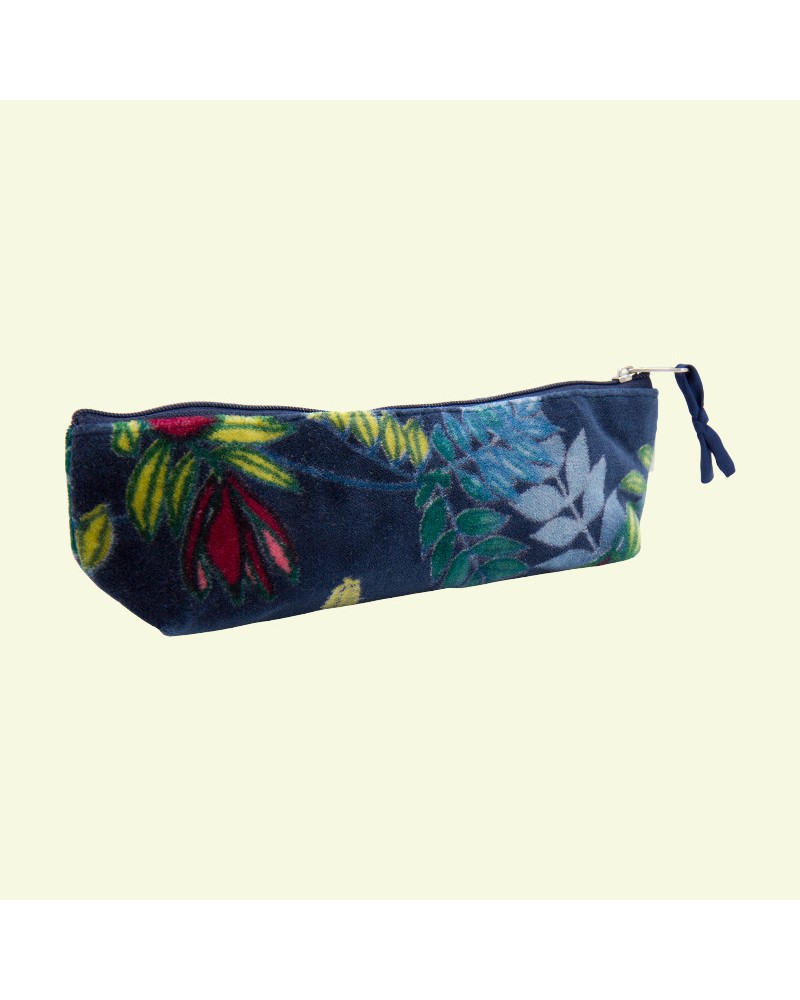 Questo astucciò portapenne in velluto liscio blu è impreziosito da una delicata stampa floreale, che lo rende raffinato e distintivo.