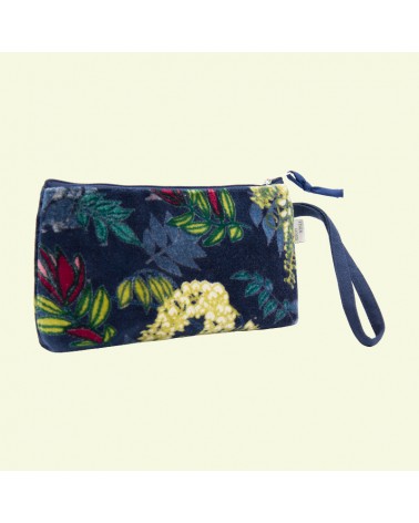 Questa pochette in velluto liscio blu con stampa floreale è ideale da portare a mano grazie al suo piccolo manico, unendo praticità e stile.