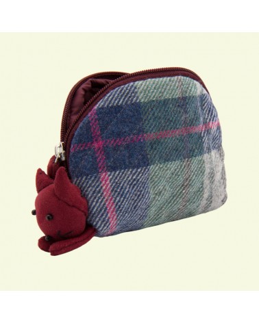 Questo portamonete a forma di cane combina tweed e velluto a coste bordeaux, creando un design unico e divertente.