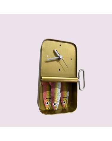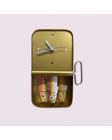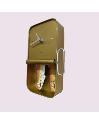 Orologio da parete a pendolo scatola di sardina in metallo riciclato con pesce dorato.