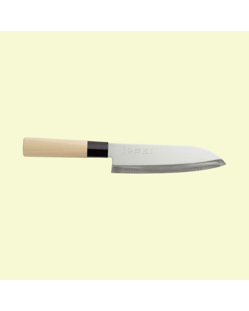 Coltello giapponese santoku in acciaio inossidabile manico in legno.