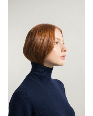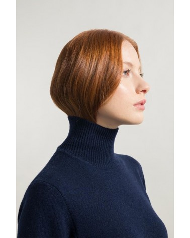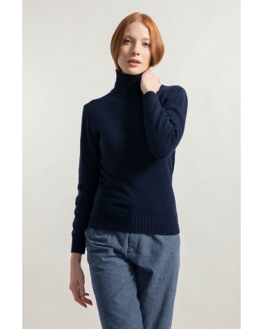 Maglione donna blu mora in cashmere rigenerato collo alto Made in Italy.